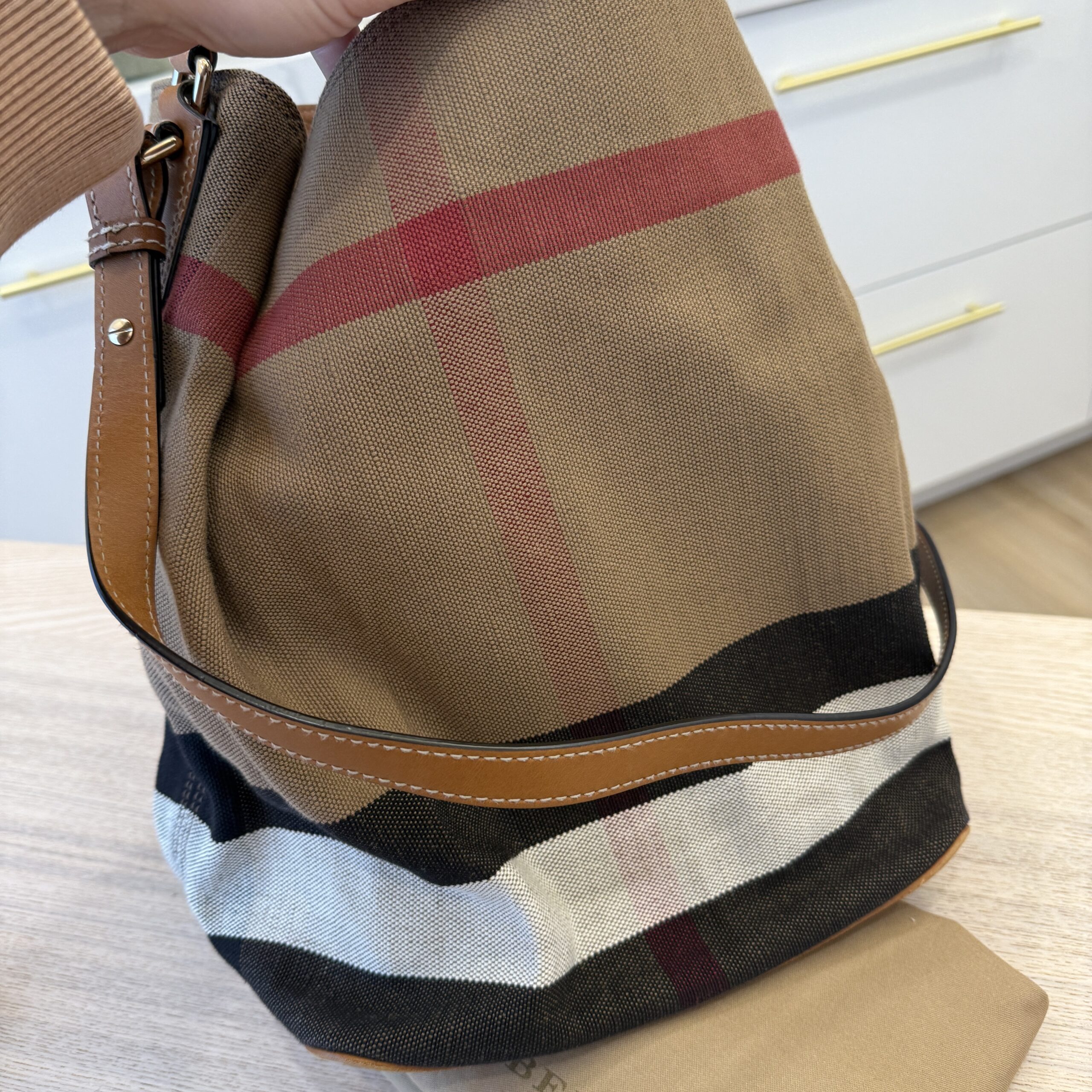 Burberry Canvas Mega Check Medium Ashby Hobo Saddle Brown