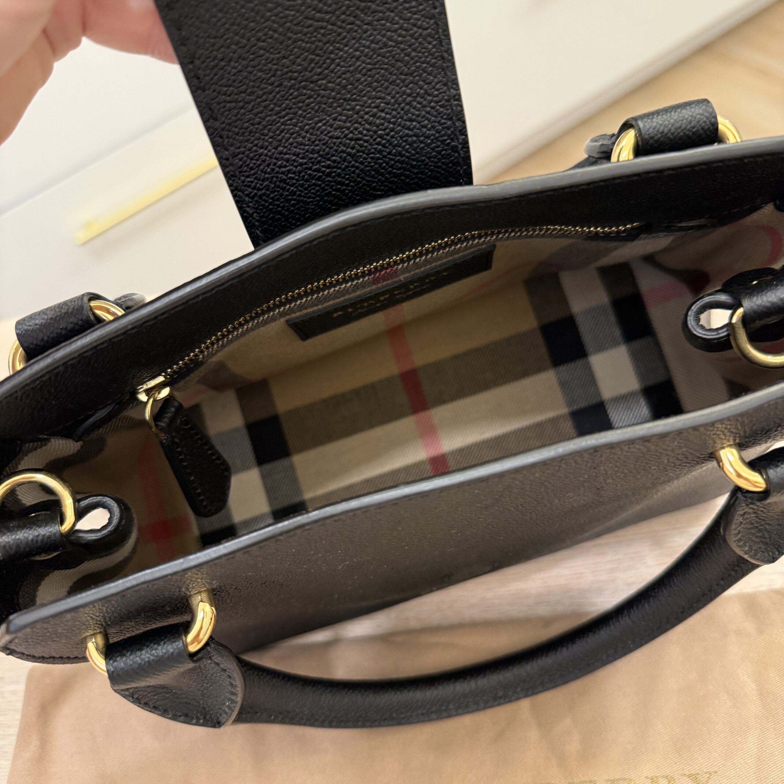 Clean inside and out, gently used, comes with a reversible shoulder strap you can use on the black or house check side and an adjustable crossbody strap