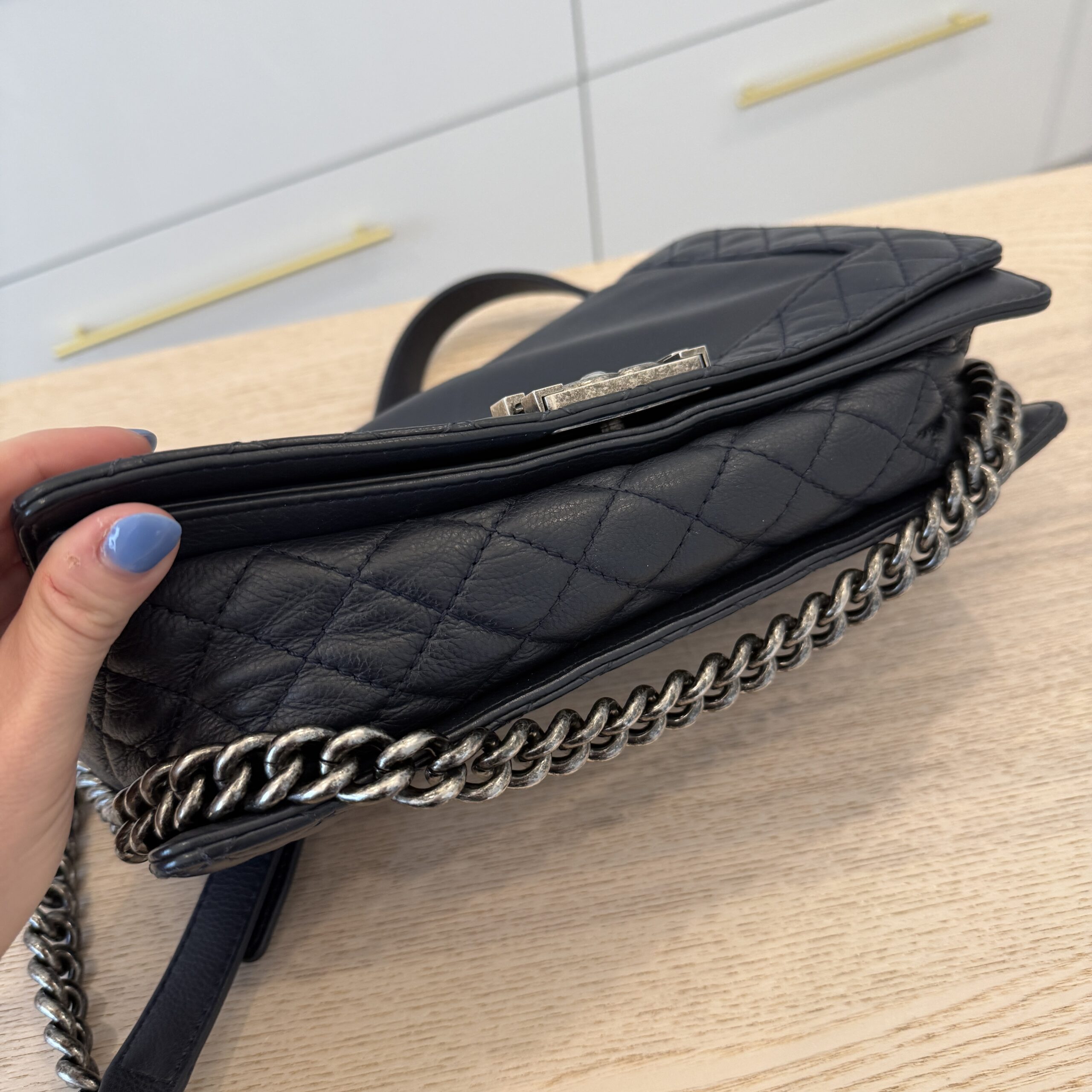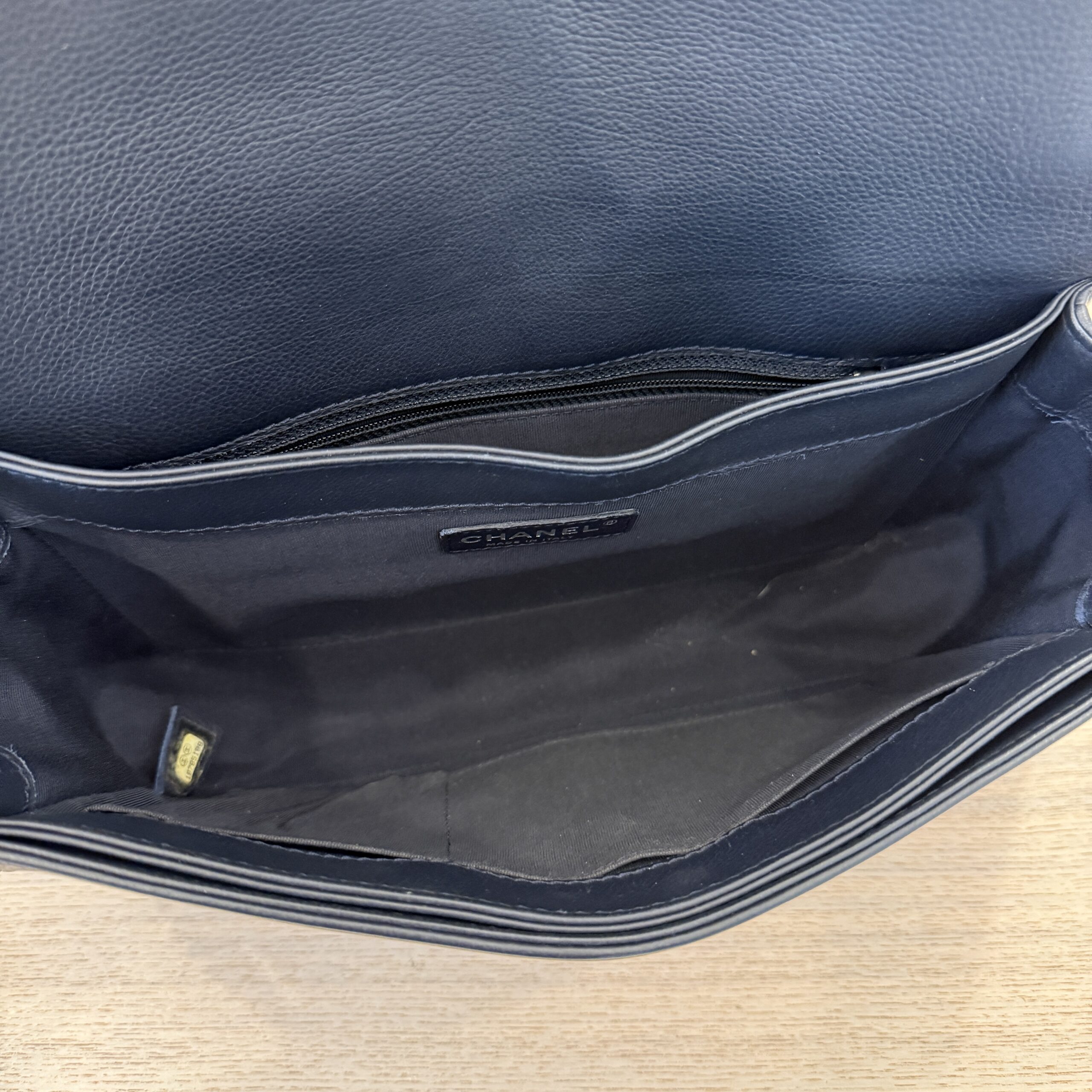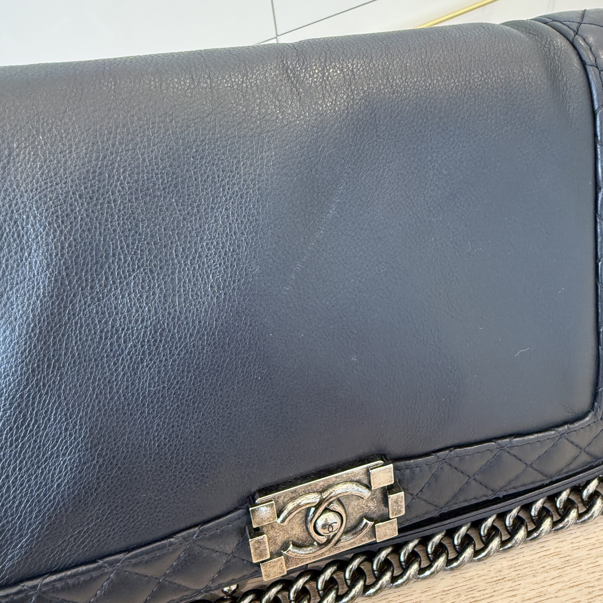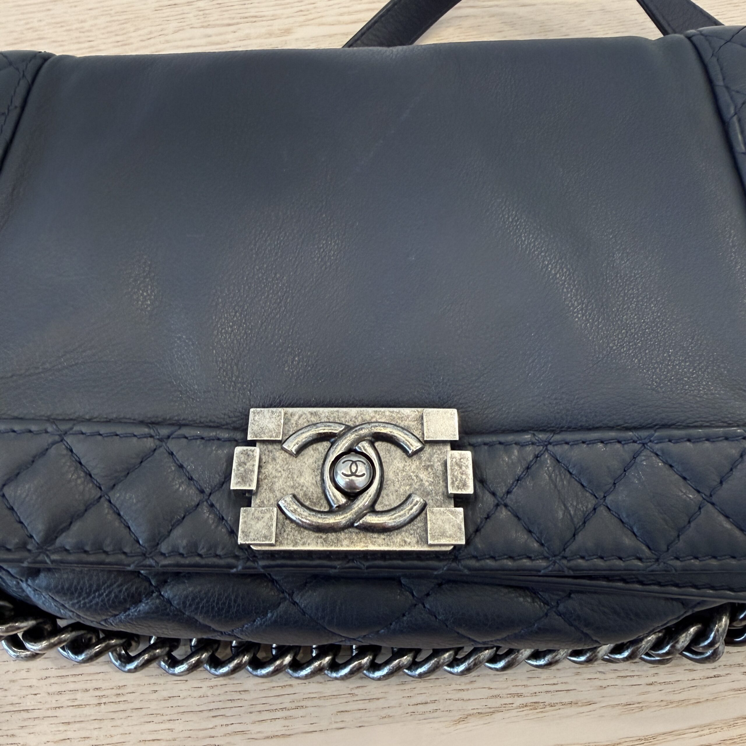 Clean inside with just light wear, light leather wear, light hardware scratches, navy color (dark, but not black), softer boy bag so makes this a great everyday bag, some light fingernail scratches to the leather, light, and I tried my best to photograph them