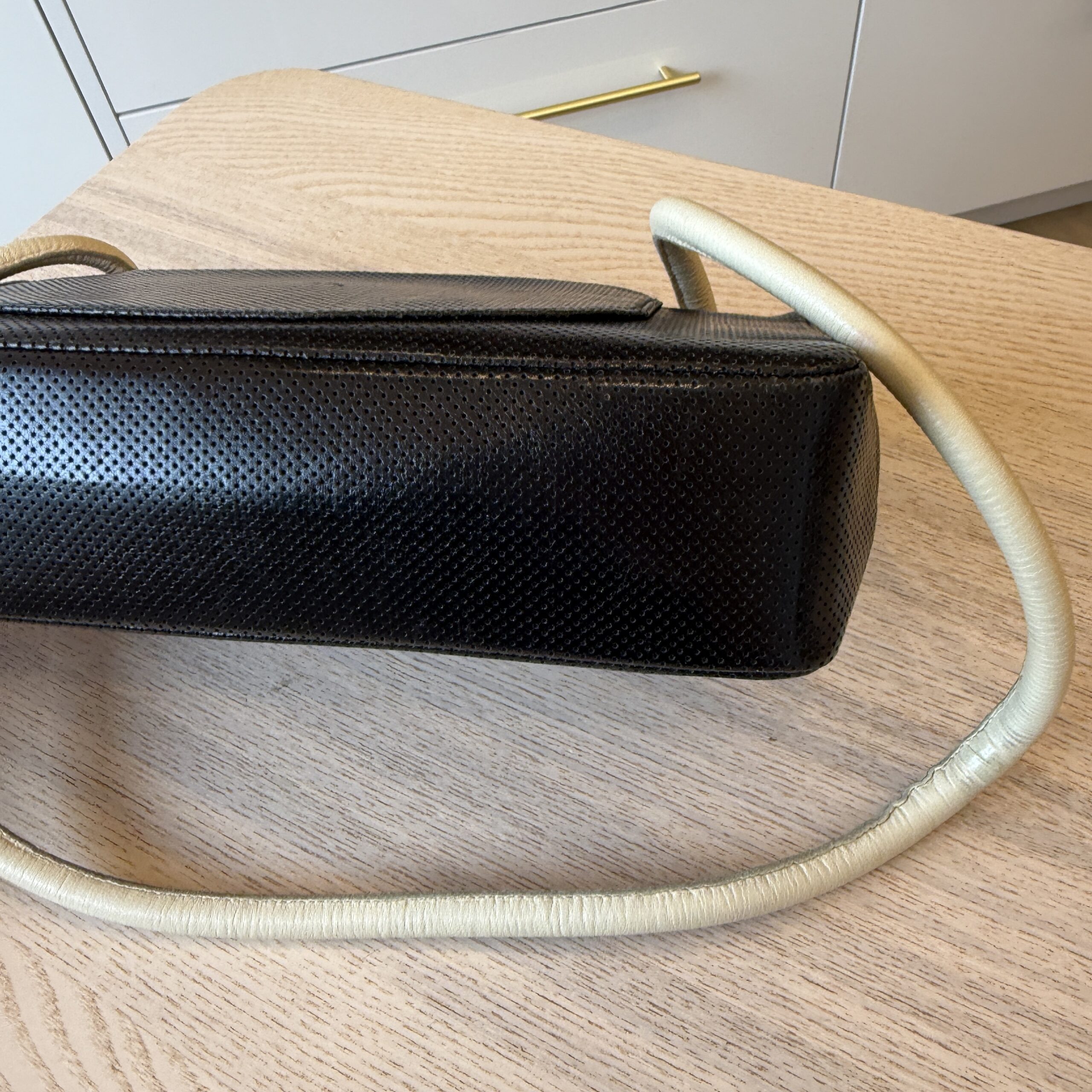 Good vintage condition, can go shoulder or long shoulder, the coolest strap, its made of leather, bead stops its form moving through (light separation by bead) doesn’t affect anything, light leather wear on strap, leather is perforated, antique gold hardware, light leather wear, vintage condition, please make sure to review all pictures