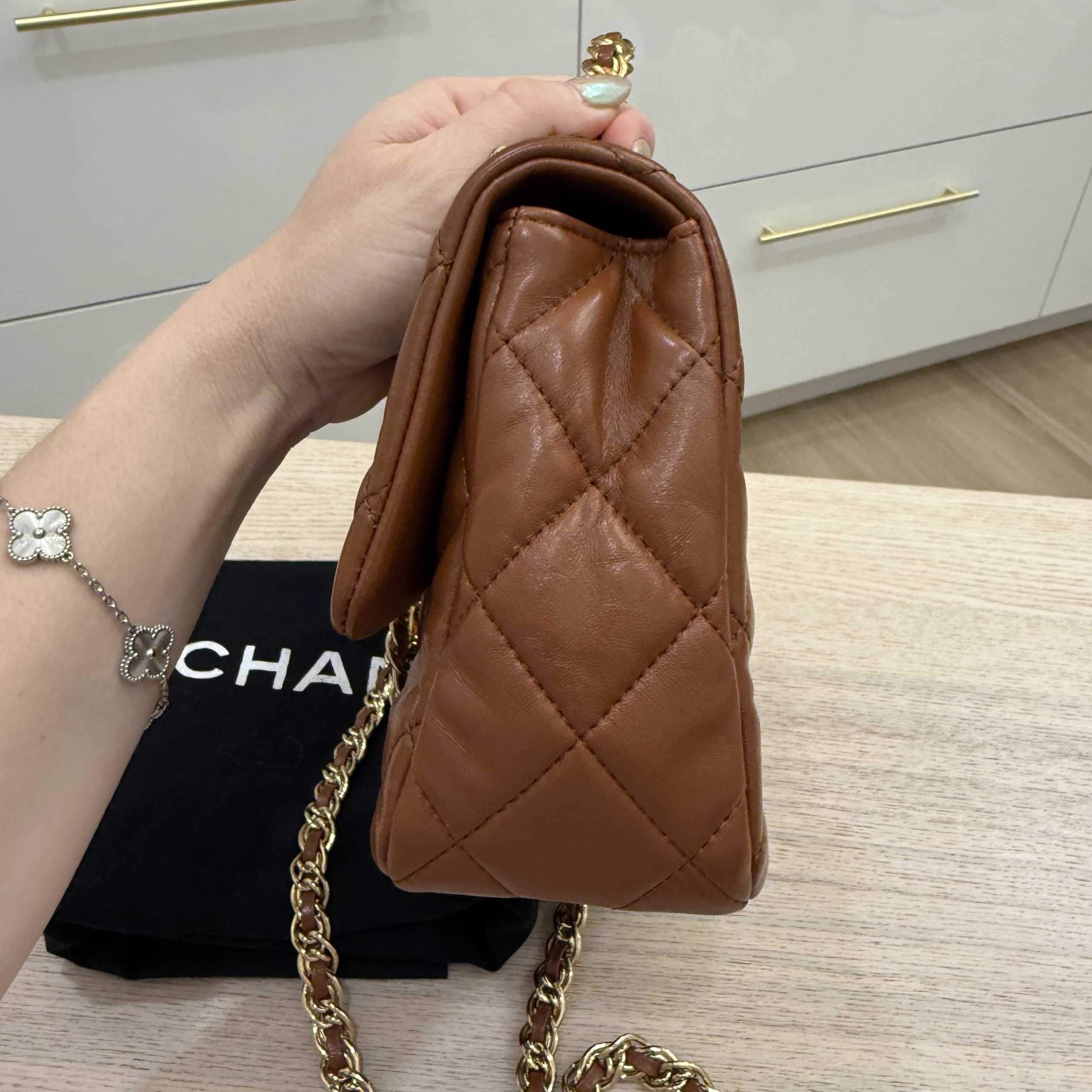 rdcdn Chanel Shiny Lambskin Quilted Golden Links Top Handle Flap Caramel