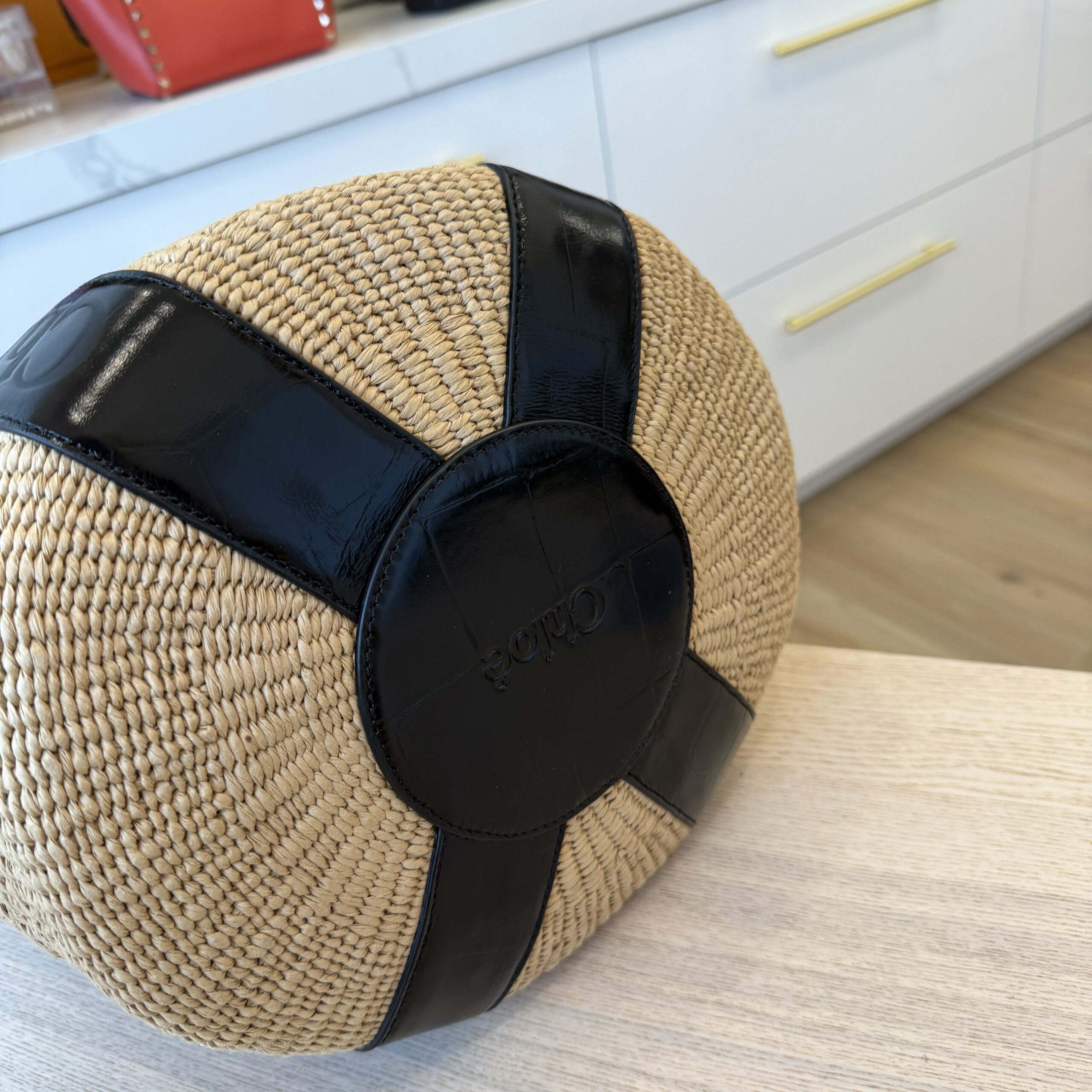 Chloe Raffia Calfskin Crocodile Embossed Large Woody Tote Black