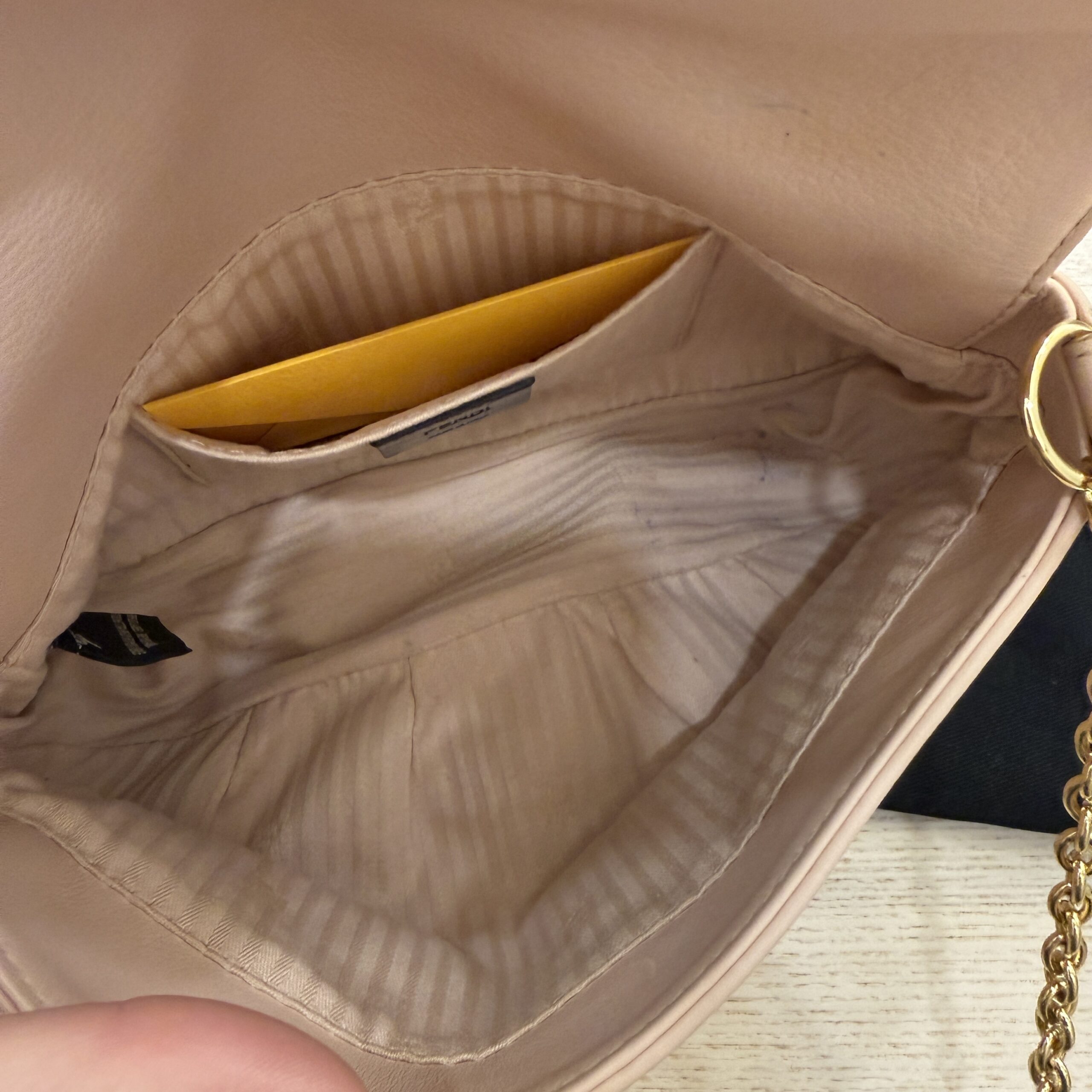 Two tiny marks inside, light leather wear as pictured, light hardware scratches, goes crossbody, strap is removable to also be a clutch, fits pro max