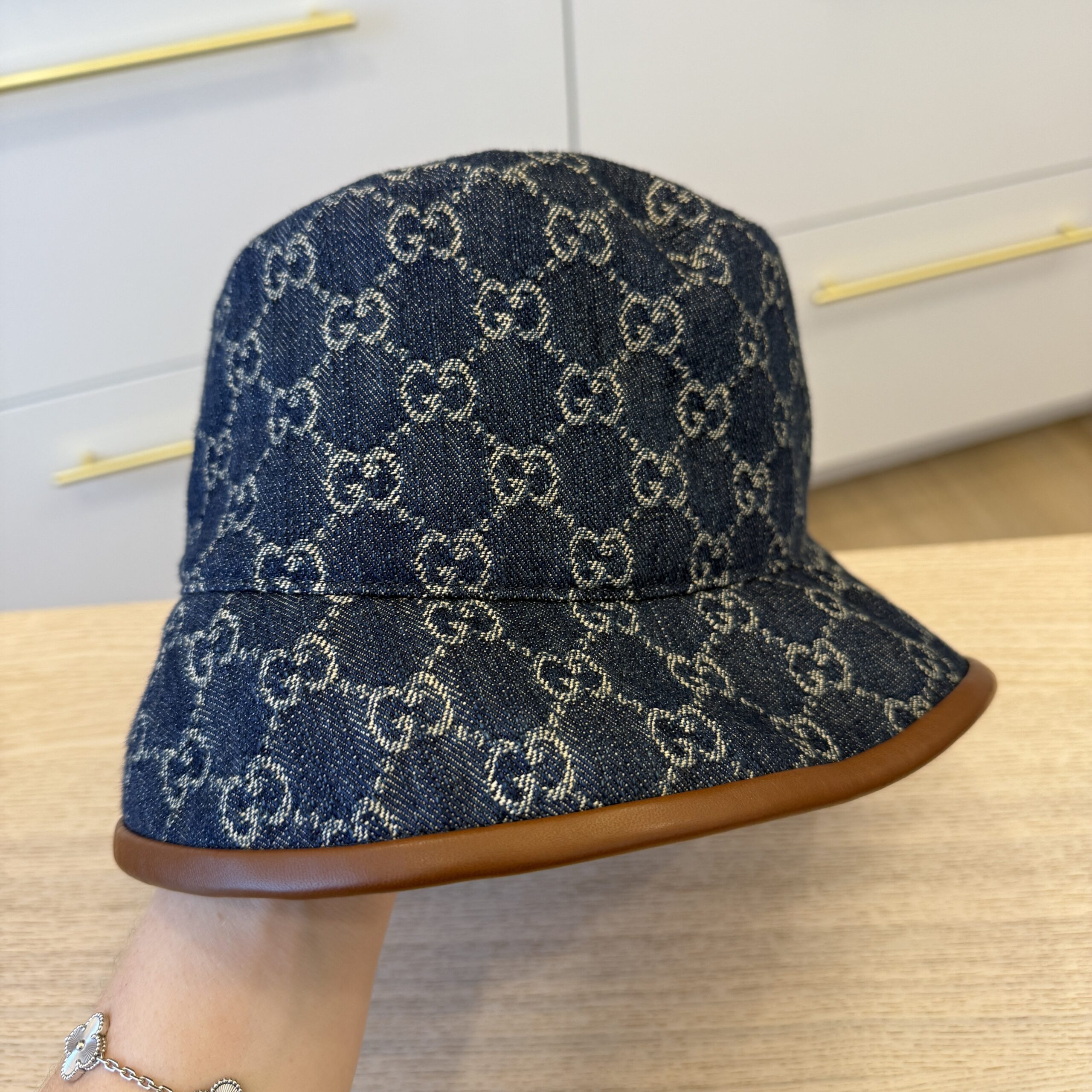 rdcdn Gucci Blue Denim Leather Trim Medium Bucket Hat