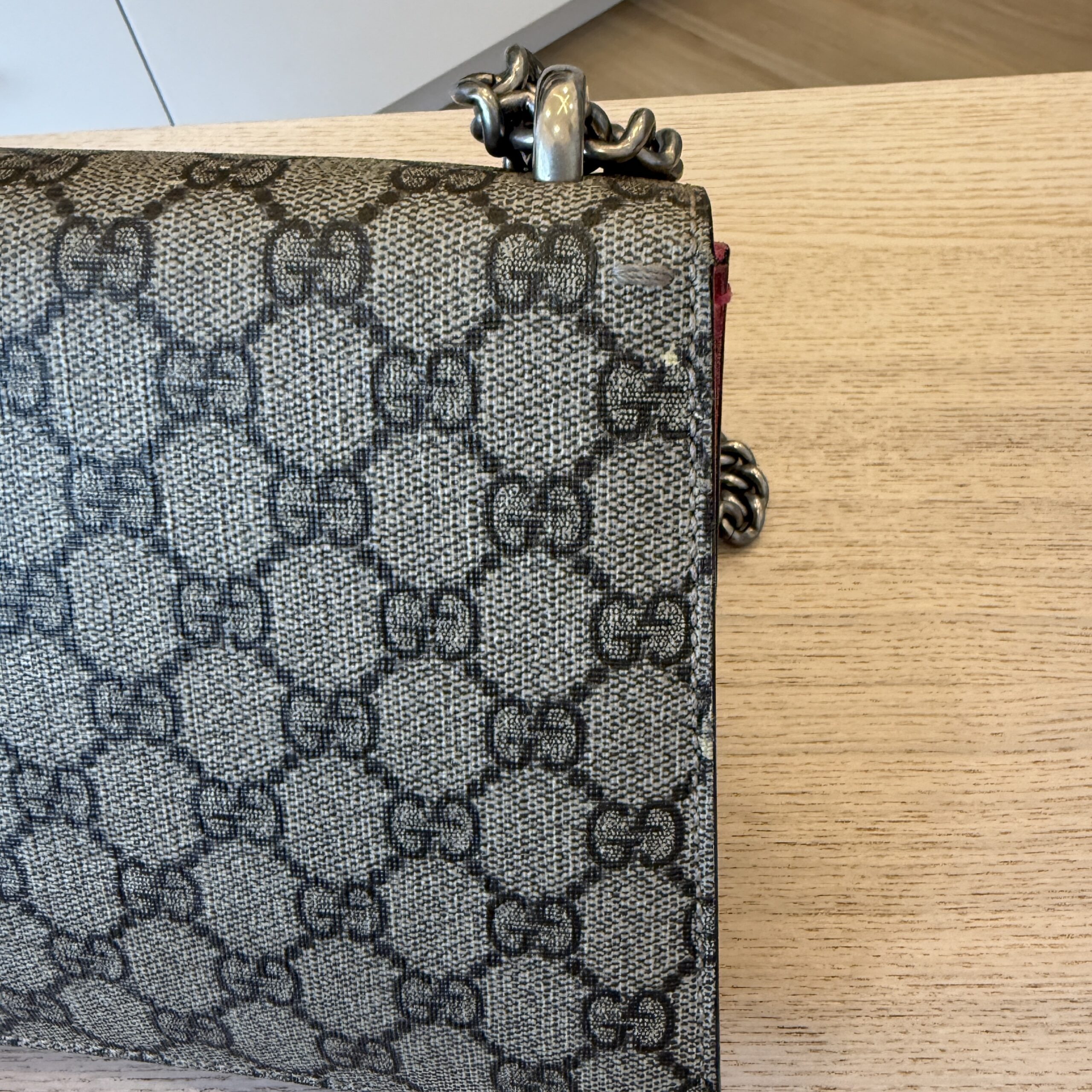 Light suede wear, light hardware wear, light leather wear, light canvas wear in two spots as pictured, one in the front from opening and closing and one in the back as pictured, heavily discounted due to this, but works great, can go shoulder or crossbody