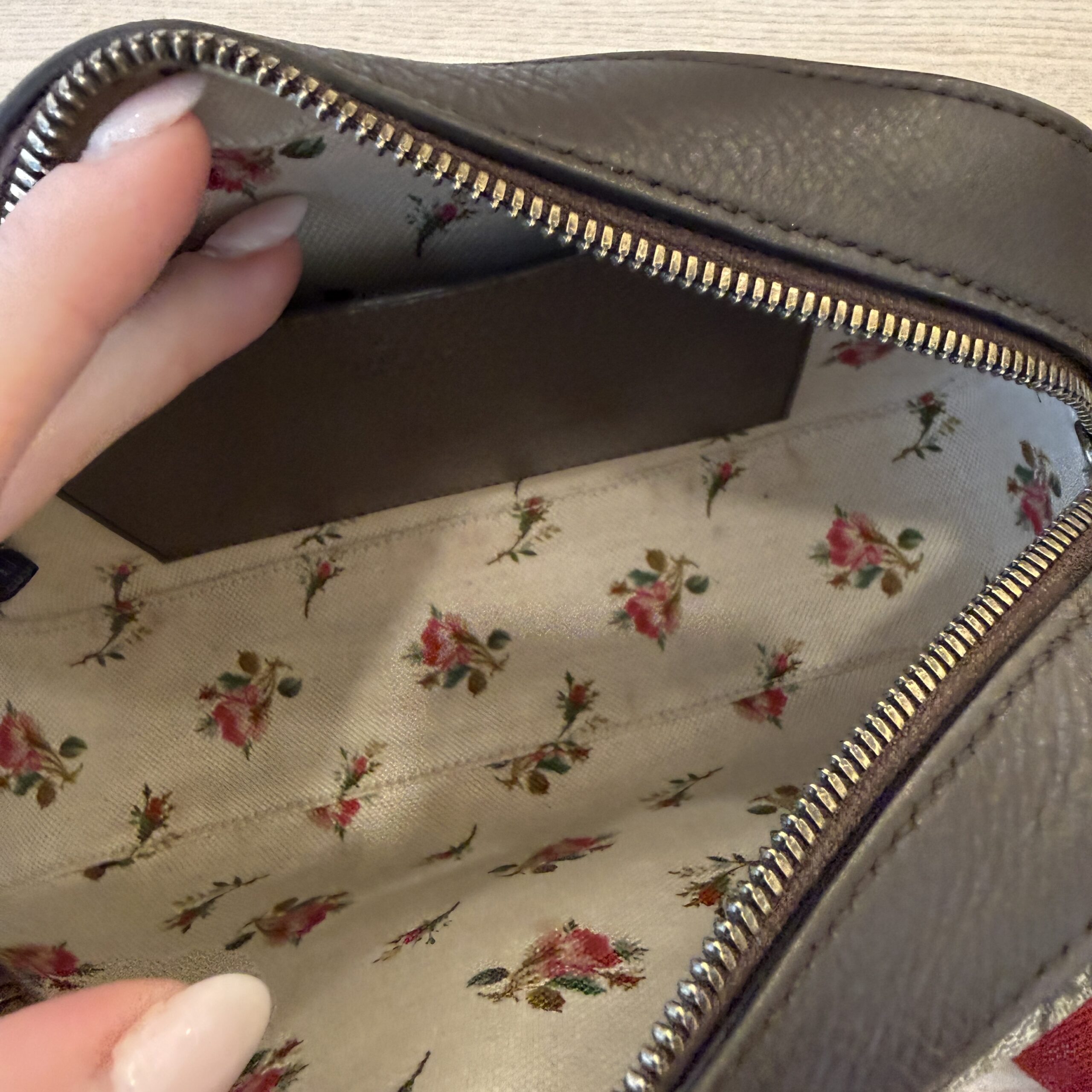 Zipper runs smooth, light marks inside, light leather wear, light overall wear