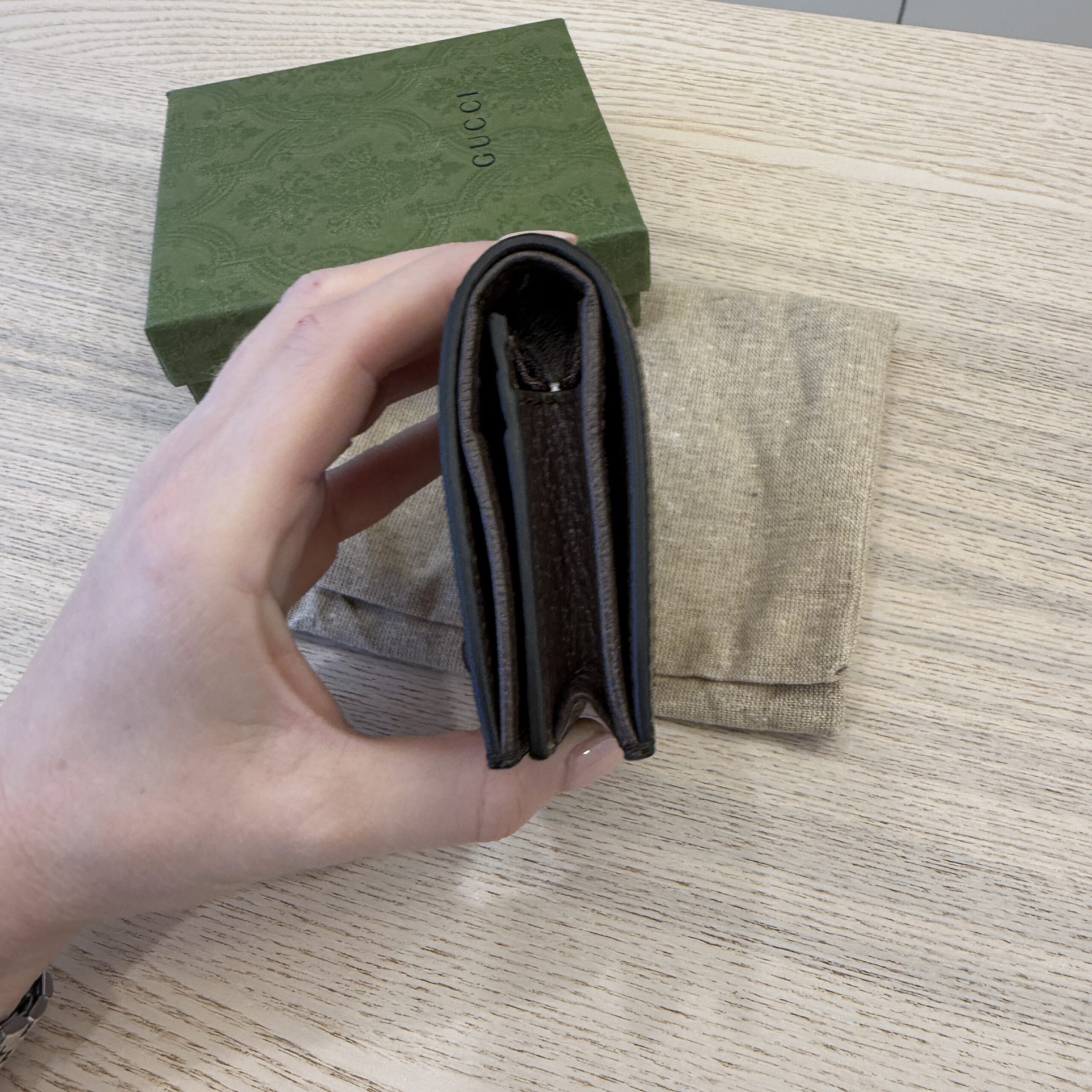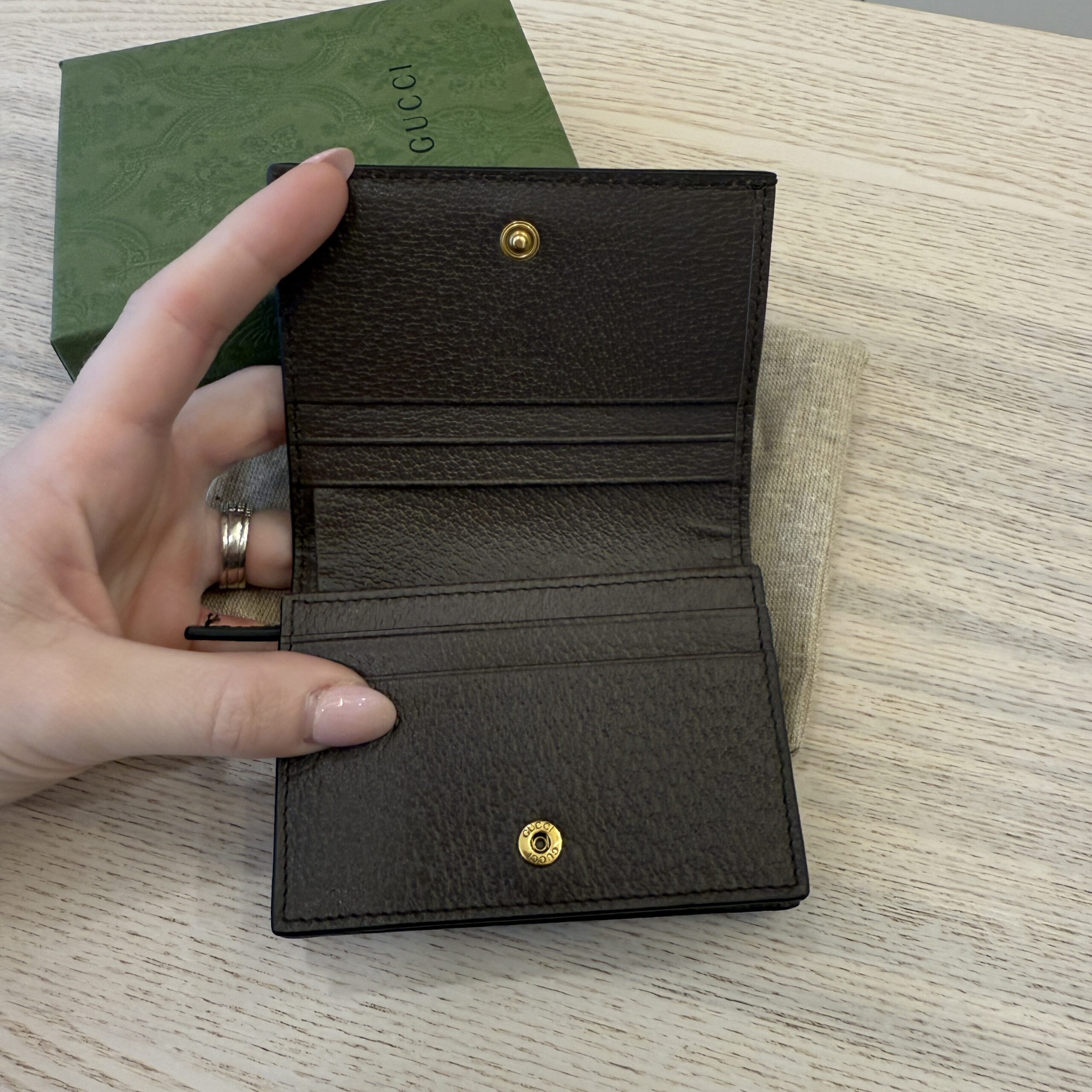 rdcdn Gucci Monogram Jumbo GG Textured Dollar Calfskin Diana Card Case Wallet Camel Ebony New Acero