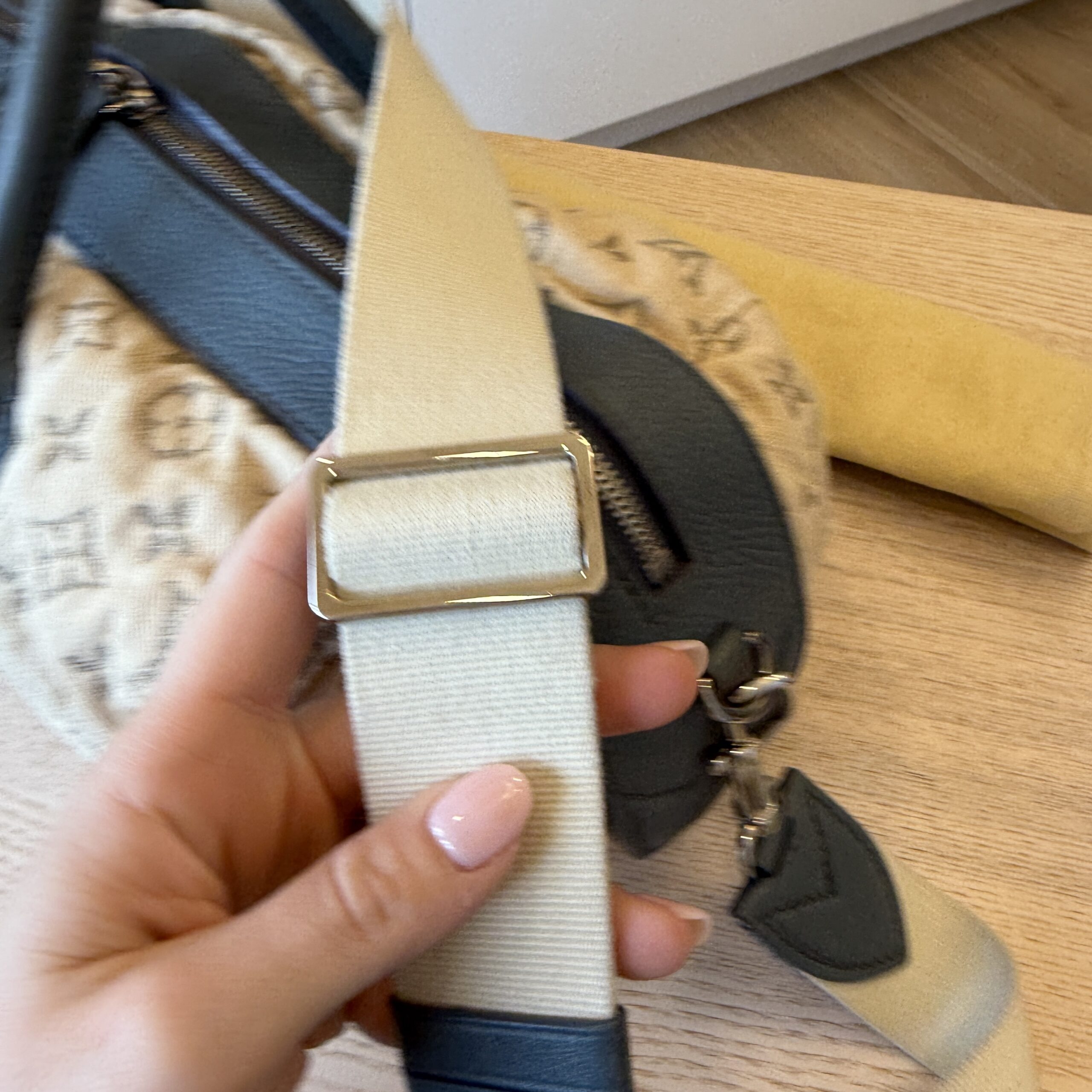 Handles: Double rolled calf leather handles and a removable, adjustable canvas strap