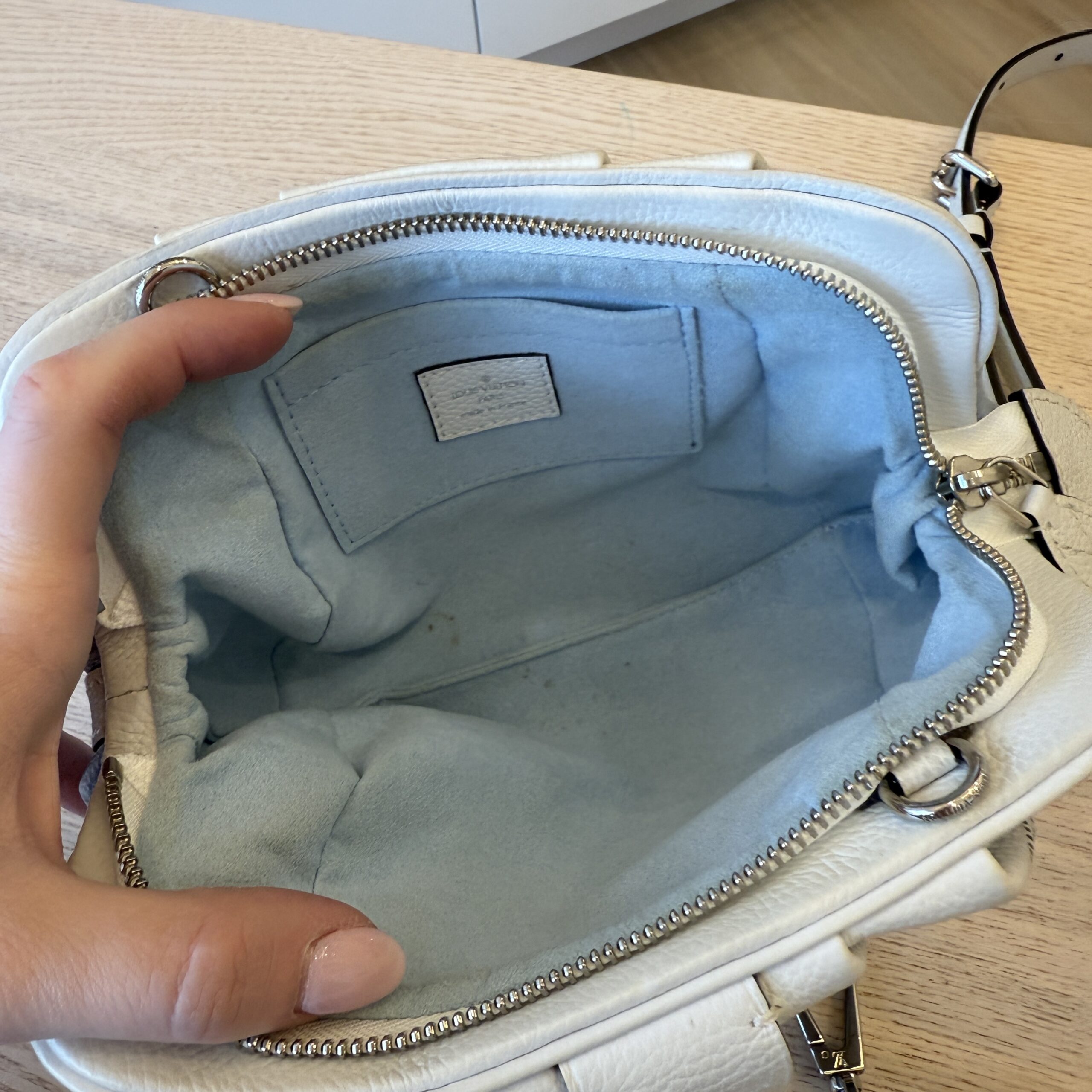Adjustable strap, zipper runs smooth, outside is perfect, light wear near top trim of the bag inside, otherwise its in great shape
