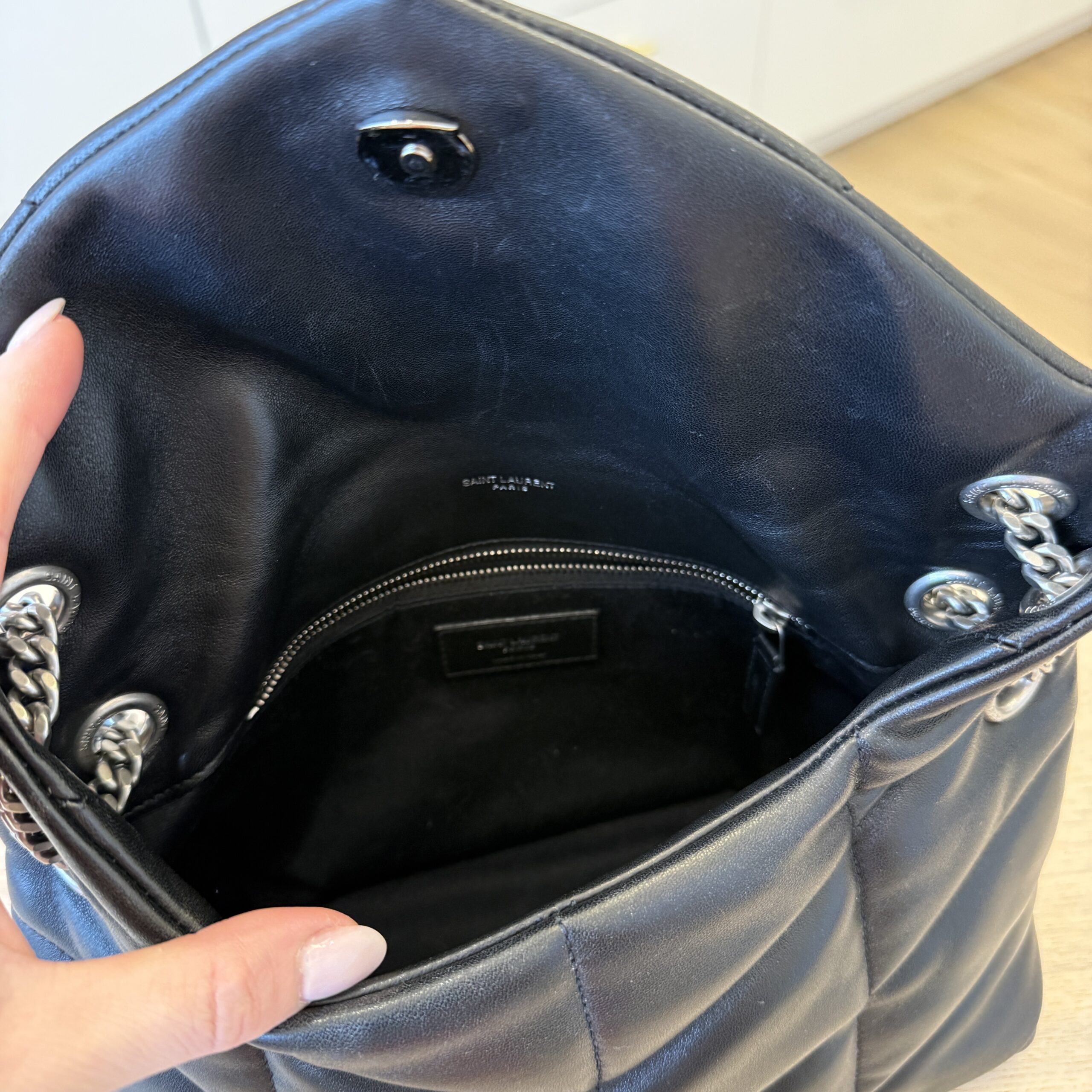 Saint Laurent (YSL) Lambskin Quilted Small Loulou Puffer Monogram Chain Satchel Black